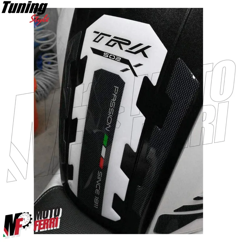 Paraserbatoio Made in Italy, realizzato in resina con Carbon Look (simil carbonio) Bianco e Scritta TRK 502 X in nero. I nostri adesivi decorano e rendono unica la tua Benelli TRK 502X, compatibile con tutte le annate moto, riparano da Urti e Graffi e resistono alle Intemperie ed ai Raggi U.V.