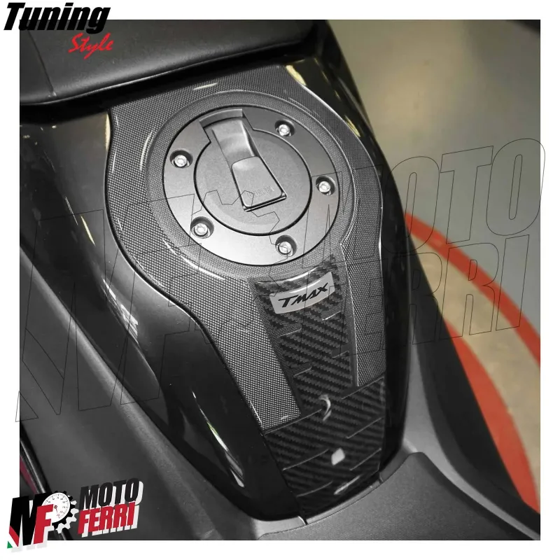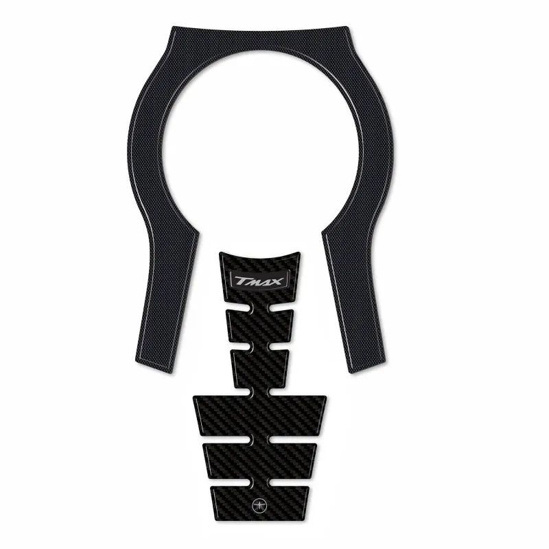 Protezioni Adesive per il Tunnel centrale nella zona del tappo serbatoio per TMax 560cc 2022/2024. Grafica con base in effetto carbonio ed antiscivolo. Adesivi resinati effetto 3D, MADE IN ITALY.