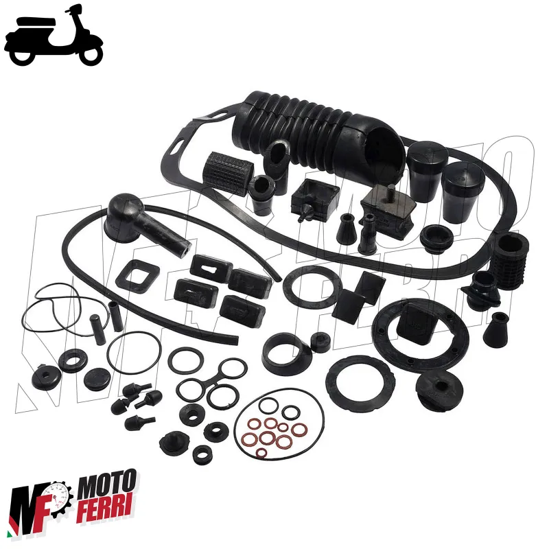 Set di ricambio per le parti in gomma di una Vespa PX. Nel corso degli anni, a causa degli agenti atmosferici, la gomma diventa porosa, perde il suo colore e alla fine inizia a screpolarsi. L'unica cosa che aiuta in questo caso è sostituire i pezzi. Questo set è ideale per riparazioni o restauri. Per l'installazione e la manutenzione, consigliamo di inumidire le parti con uno spray al silicone.