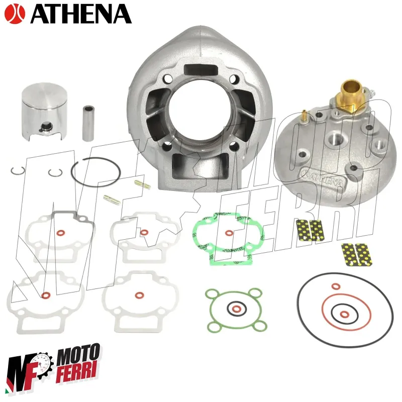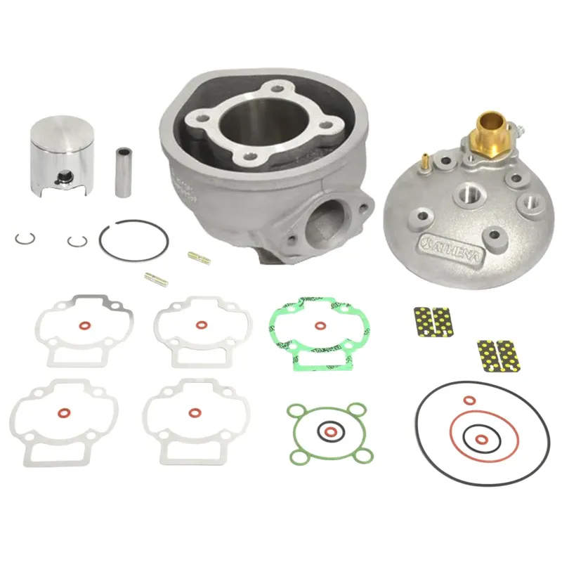 Il kit comprende il cilindro in alluminio di alta qualità con alesaggio aumentato, la testa cilindro, il pistone con testa bombata completo di spinotto pistone e anellini, e le guarnizioni necessarie.