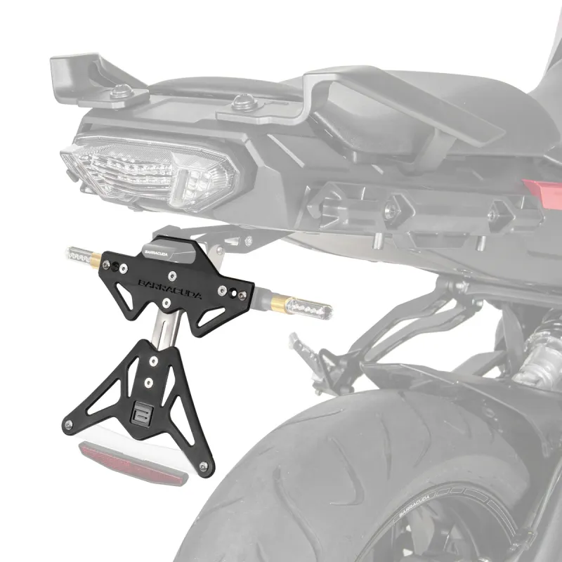 Il Portatarga Barracuda è regolabile, dispone di uno snodo in acciaio che ne garantisce la robustezza alle vibrazioni.