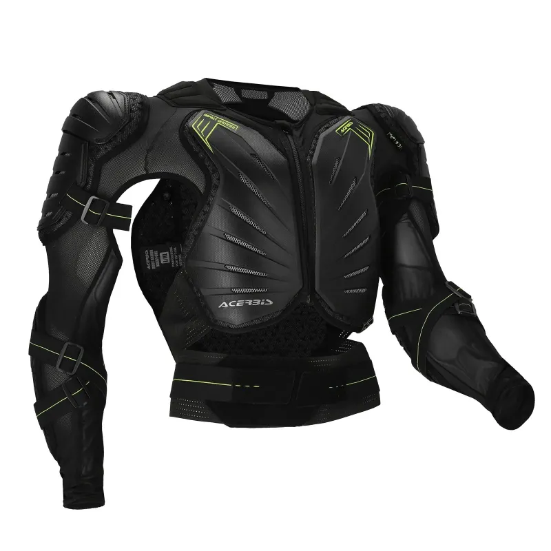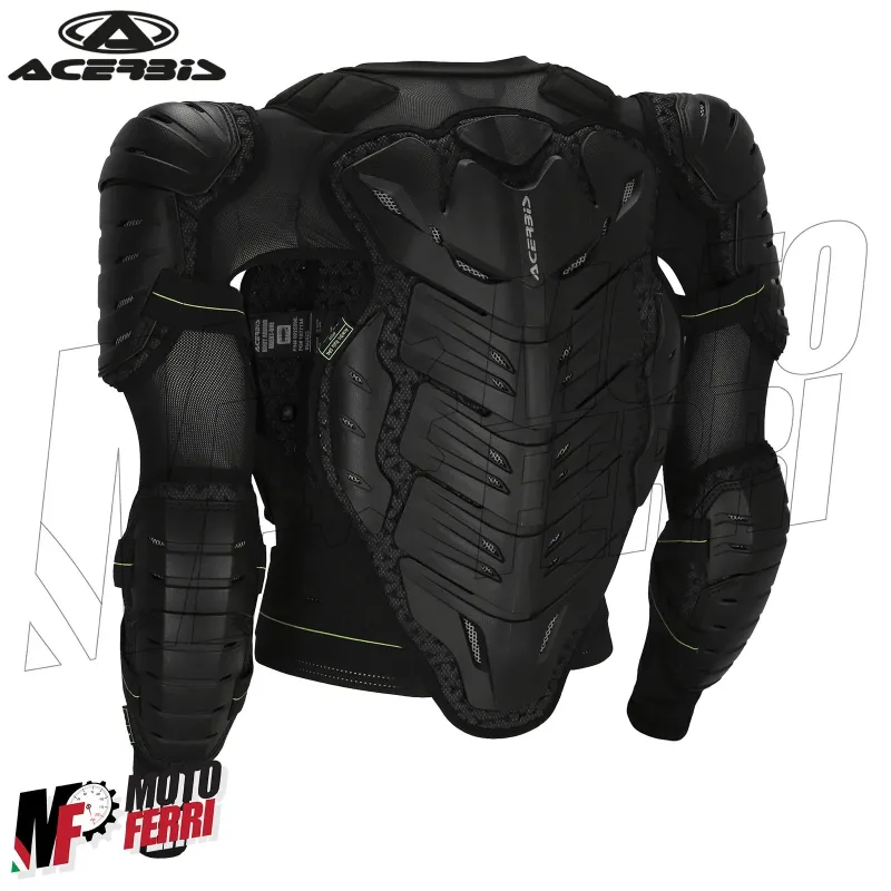 Inserto con logo Acerbis su plastiche front e back. Etichette cucitive omologative a loop sotto plastica su chest, back, spalla sinistra e gomito sinistro.